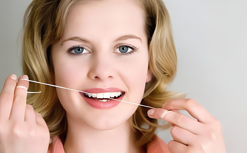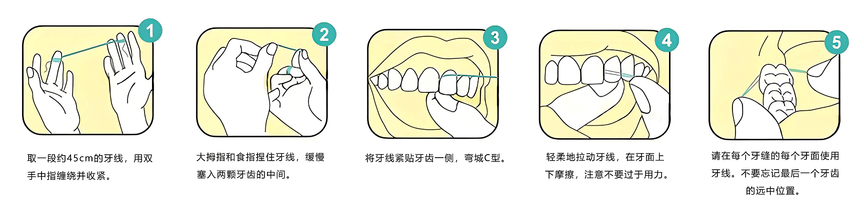 5、请在每个牙缝的每个牙面使用牙线。不要忘记最后一个牙齿的远中位置。